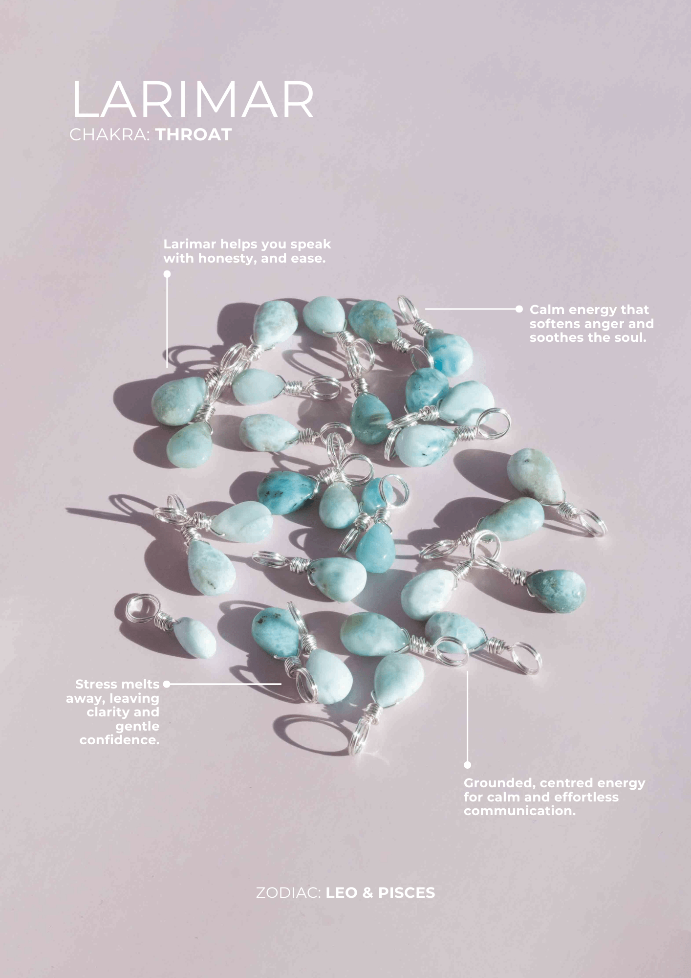 Larimar is a soothing crystal that promotes calm, emotional balance, and clear, graceful self-expression.