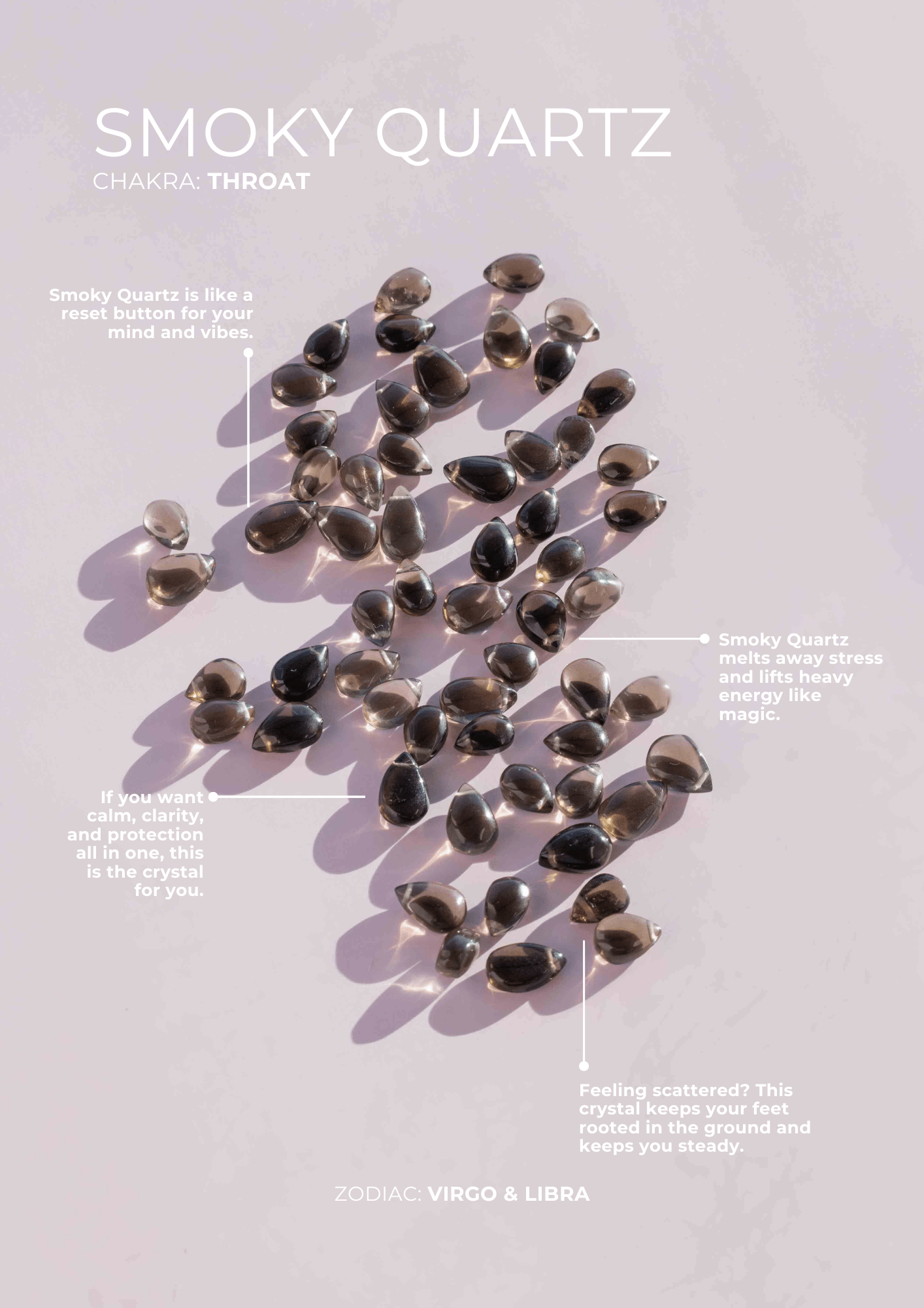 Smoky Quartz is a grounding crystal that clears negativity, calms anxiety, and restores emotional clarity and stability.