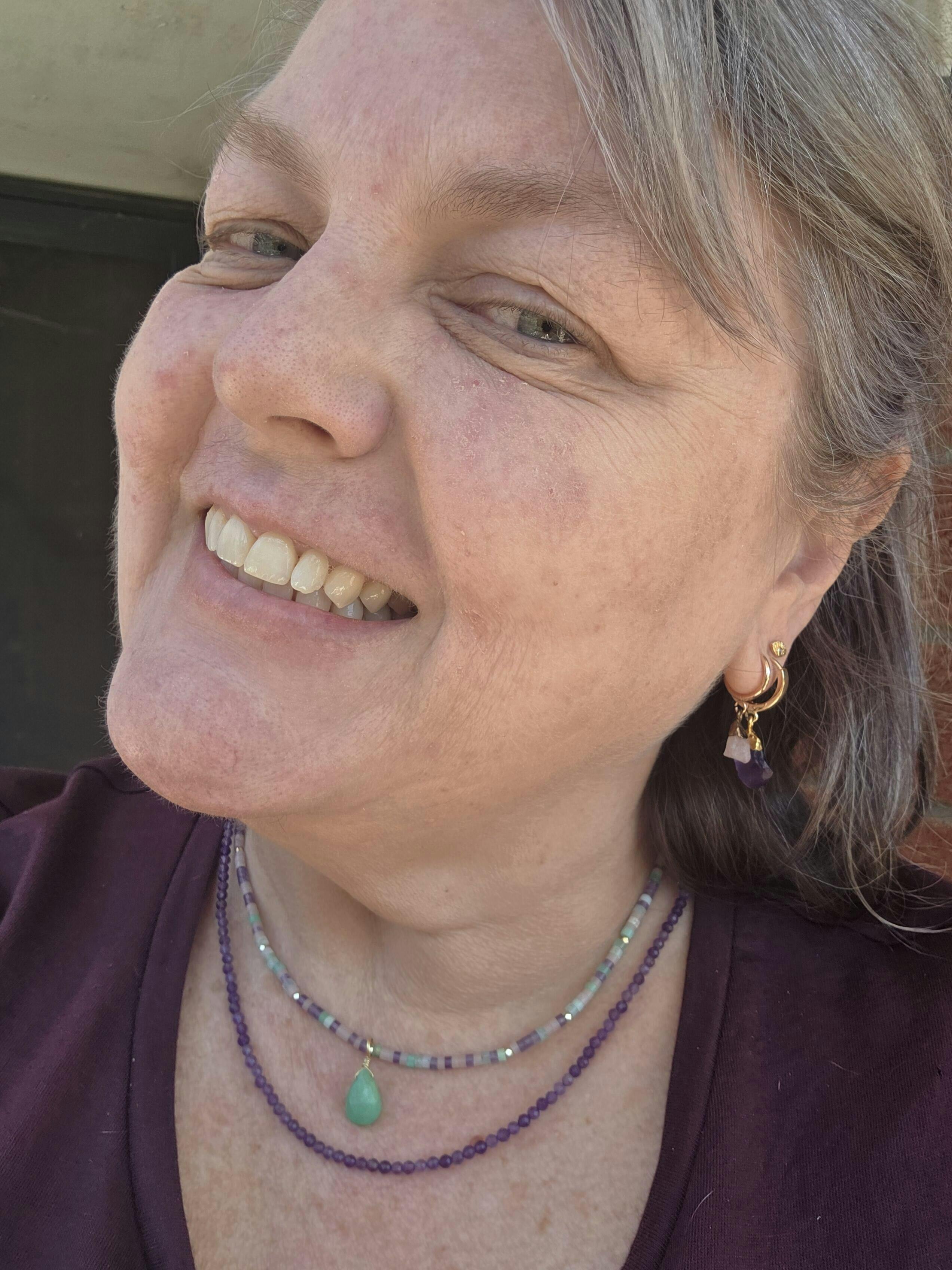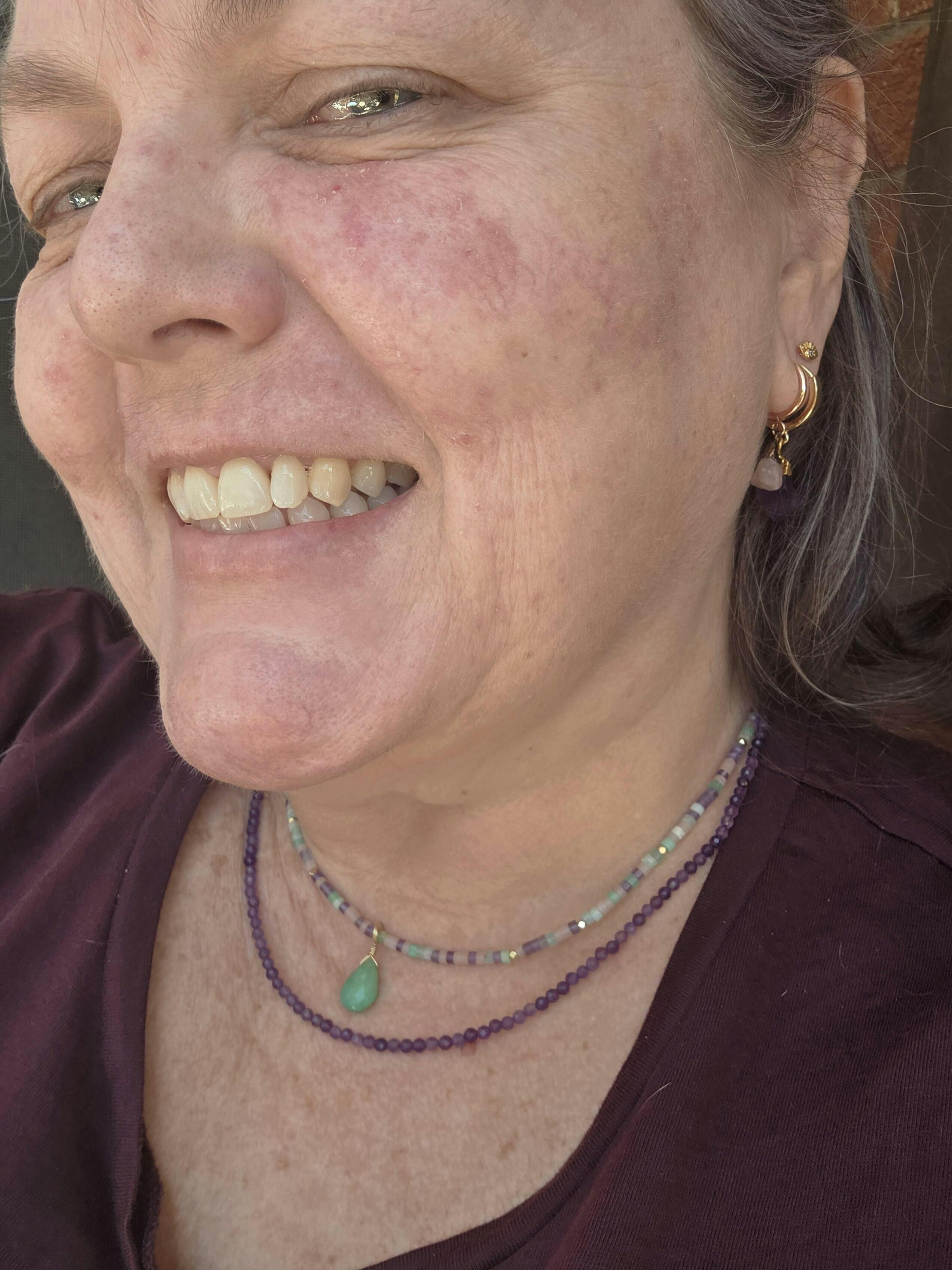 The TenderBeadedNecklace features Amethyst, Chrysoprase & Pink Opal.