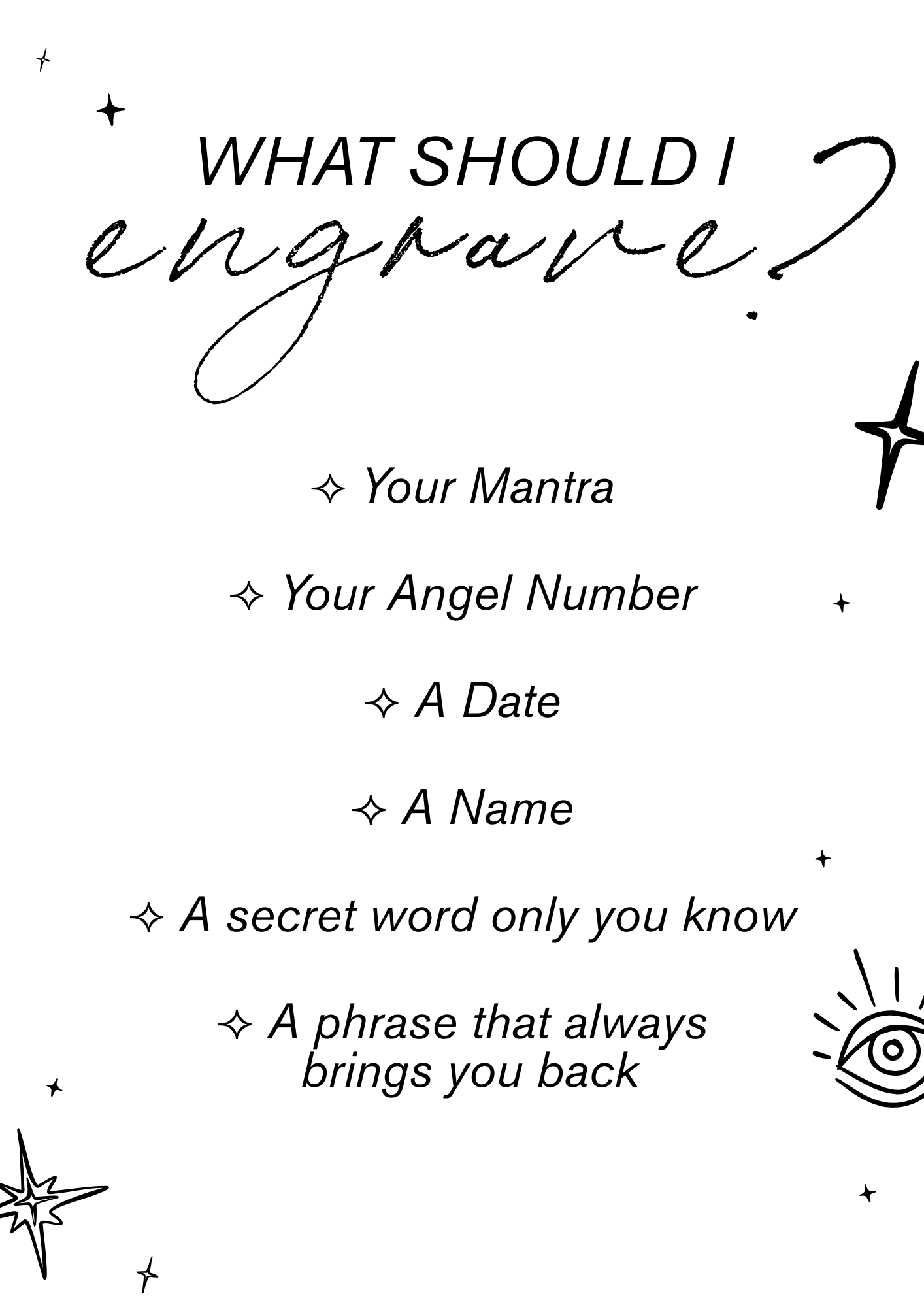 Create something truly personal. Our engravable pieces are designed to carry your most meaningful moments - names, dates, symbols, or words that deserve to stay close to your heart.